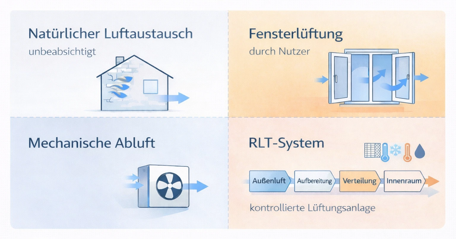 Moderne Lüftungsanlagen bestehen aus Lüftungsgeräten, Ventilatoren, Luftfiltern und Lüftungsleitungen, die gemeinsam als Lüftungssystem oder raumlufttechnische Anlage (RLT-Anlage) betrieben werden. Durch Filtertechnik können Partikel wie Staub, Feinstaub oder Pollen aus der Zuluft reduziert werden, während der kontinuierliche Luftaustausch zur Abfuhr von Kohlendioxid, Feuchte und Gerüchen beiträgt. Je nach System kann die Lüftungsanlage auch Einfluss auf die Luftfeuchtigkeit nehmen, entweder indirekt durch den Luftwechsel oder über integrierte Befeuchtungs- und Entfeuchtungseinheiten.