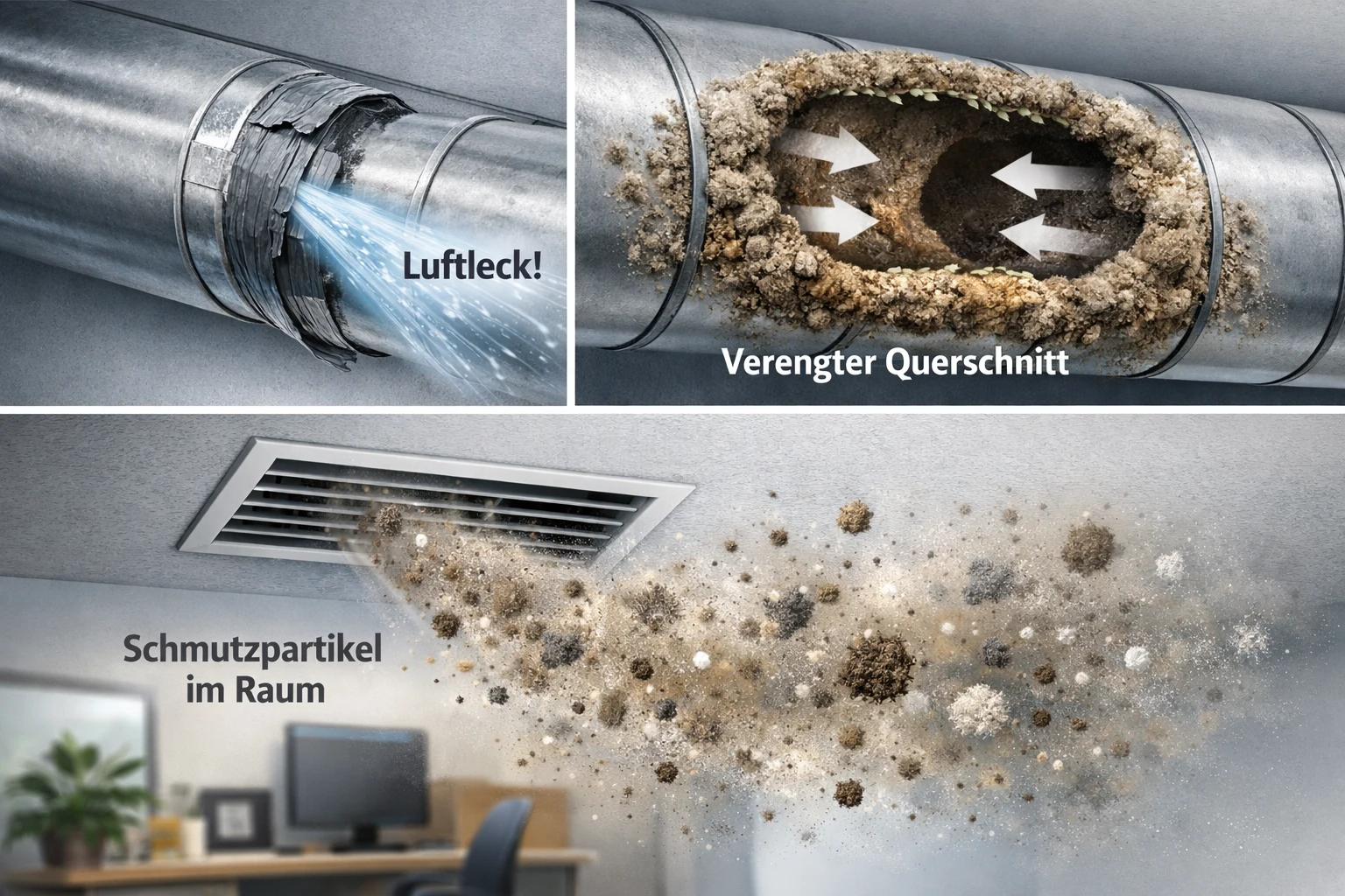 Verschmutzte Luftleitungen können den Volumenstrom reduzieren, Partikel erneut in die Raumluft eintragen und die Effizienz der Lüftungsanlage beeinträchtigen. Undichte Lüftungsleitungen führen zusätzlich zu Energieverlusten, unerwünschten Druckverhältnissen und einer Verschlechterung der Luftqualität in den versorgten Räumen.